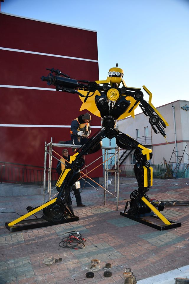 Өнгөрсөн 10-р сард ӨМӨЗО-ны Бугат хотноо аймгийн Цагдаагийн газрын дарга Г.Эрдэнэбаатар болон албаны төлөөлөлтэй айлчлал хийх үеэр цэцэрлэгт хүрээлэнгийн гадна төмрийн хаягдлаар Трансформерс киноны дүрийг бүтээсэн байсан юм.