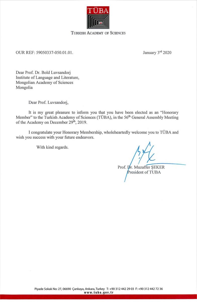 Турк улсын ШУА-ийн “Хүндэт гишүүн” болсон академич Л.Болдын цаашдын эрдмийн үйлсэд улам их амжилт хүсье.
