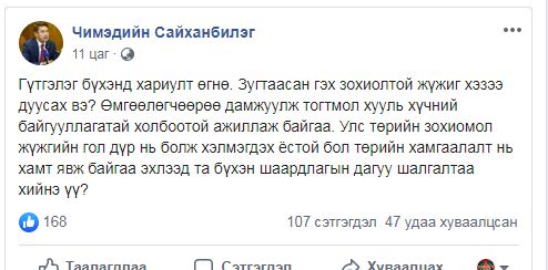 Ерөнхий сайд асан Ч.Сайханбилэг өөрийн сошиал хуудсаараа дараах байр суурийг илэрхийлсэн байна.
