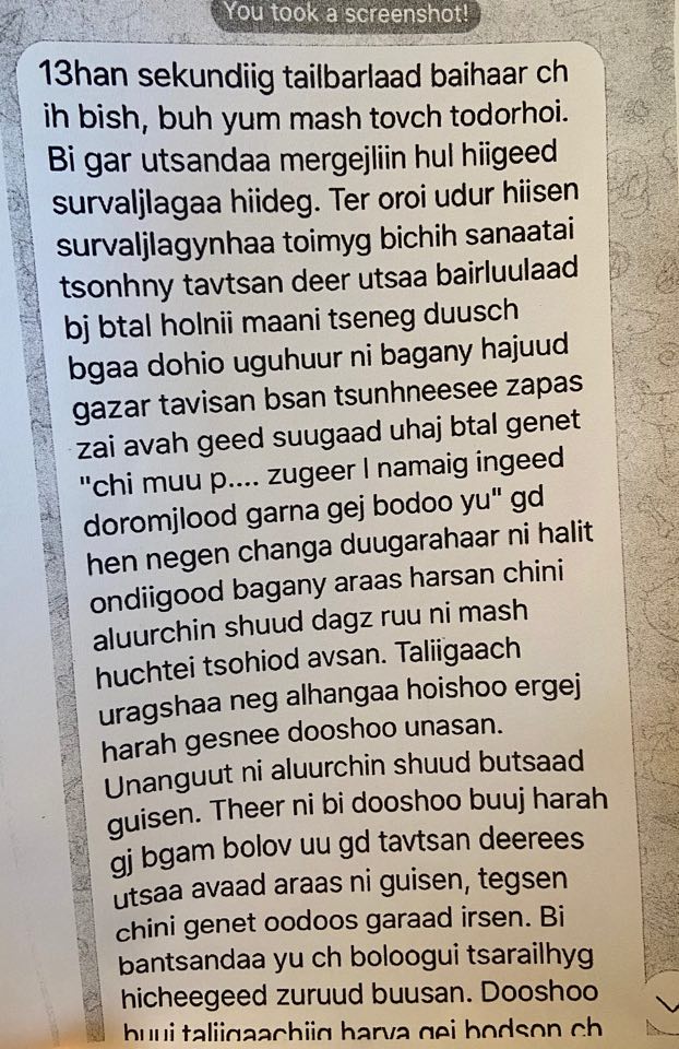 Хэргийг шалгах явцад хохирогчийн ар гэрийнхэн рүү нэр бүхий этгээд мессеж бичсэн. "Би үзсэн, харсан. 13 секундын бичлэг байгаа" гэж. Энэ мэдээллийг шалгах явцад нэг хүн тогтоогдсон. Тэр хүн одоо "мэдэхгүй, хараагүй" гээд өөр хэрэгт шалгагдаж байгаа юм билээ. Энэ бас л эргэлзэх асуудал.