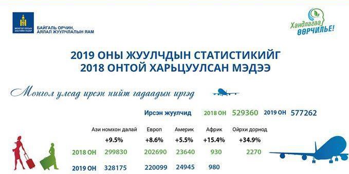 Манай улсад 2018 онд гадаадын нийт 529.360 жуулчин ирсэн бол 2019 онд 577.262 болж зорин ирэх жуулчдын тоо 9 хувиар нэмэгдлээ. 2019 онд аялал жуулчлалын салбараас олсон орлого өмнөх оноос 10.2 хувиар өссөн дүнтэй гарсан байна.