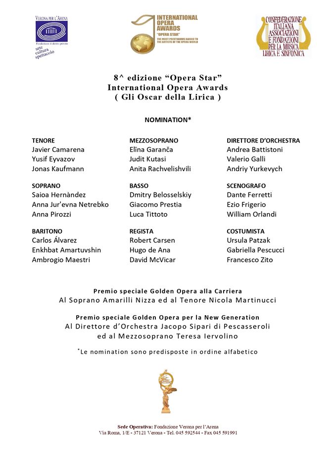 Дуурийн "Оскар" хэмээн үнэлэгддэг энэхүү нэр хүндтэй шагналд дуучид, симфони хөгжмийн удирдаач, найруулагч, урлагийн хувцасны дизайнерууд гэхчлэн 30-аад уран бүтээлч нэр дэвшжээ.