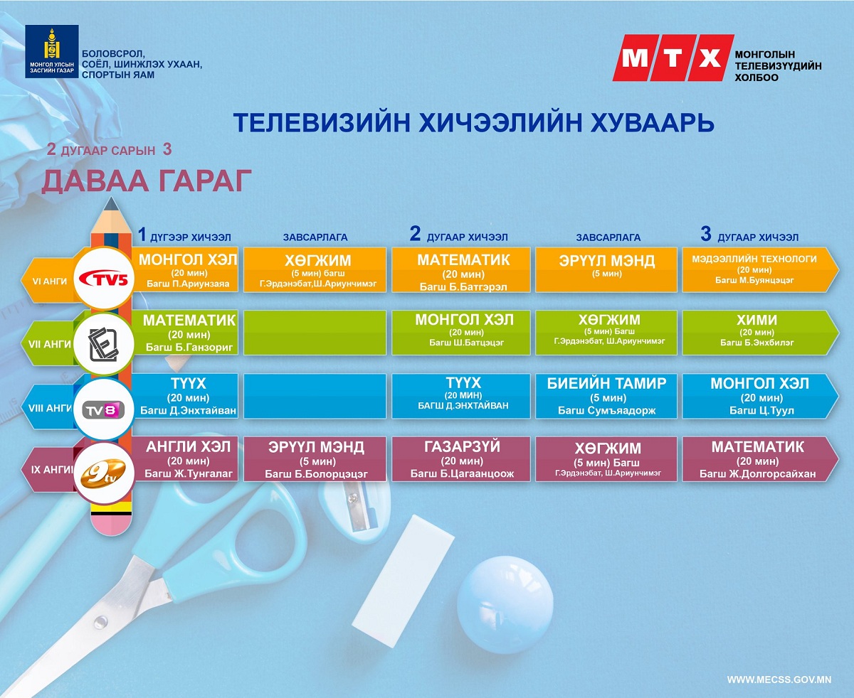 Тайлбар: Хичээлийн цагийн хуваарийг телевизүүдтэй ярилцаж тодорхой болгоно. Учир нь 2-оос дээш хүүхэдтэй айлын хичээлийн цагийг давхцуулахгүй зохицуулалт хийх ба телевизүүдийн ирэх долоо хоногийн хөтөлбөрөөс цагийг харах боломжтой.