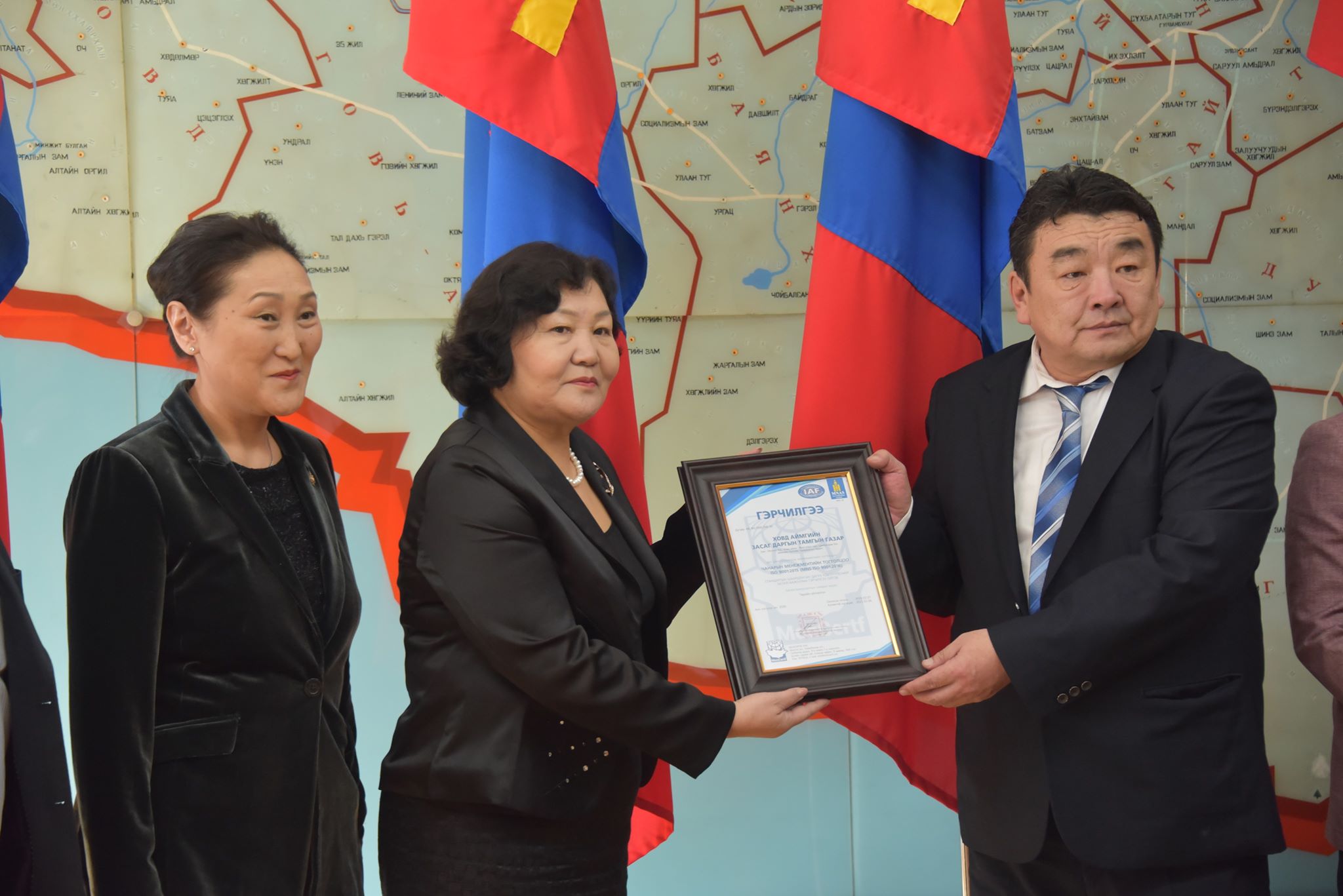 Ховд аймгийн Засаг даргын Тамгын газраас “Төрийн байгууллагуудын үйл ажиллагаанд олон улсын чанарын менежментийн тогтолцооны “ISO 9001:2015, ISO MNS 9001-2016” стандартыг нэвтрүүлэх” зорилт дэвшүүлж, аймгийн Засаг даргын Тамгын газар тус зорилтыг амжилттай хэрэгжүүлэн төрийн үйлчилгээнд стандартын шаардлагыг хангаж ажиллах батламжийн гэрчилгээг өнөөдөр Төрийн ордонд гардаж авлаа.