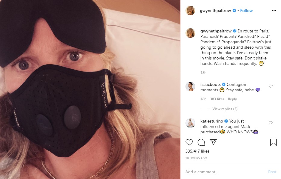 Стивен Содербергийн найруулж, 2011 онд дэлгэцнээ гарсан “Халдвар” /Contagion/ киноны од Гвинет Пэлтроу олон нийтийн сүлжээгээр коронавирусийн халдвараас сэргийлэхийг уриалжээ.