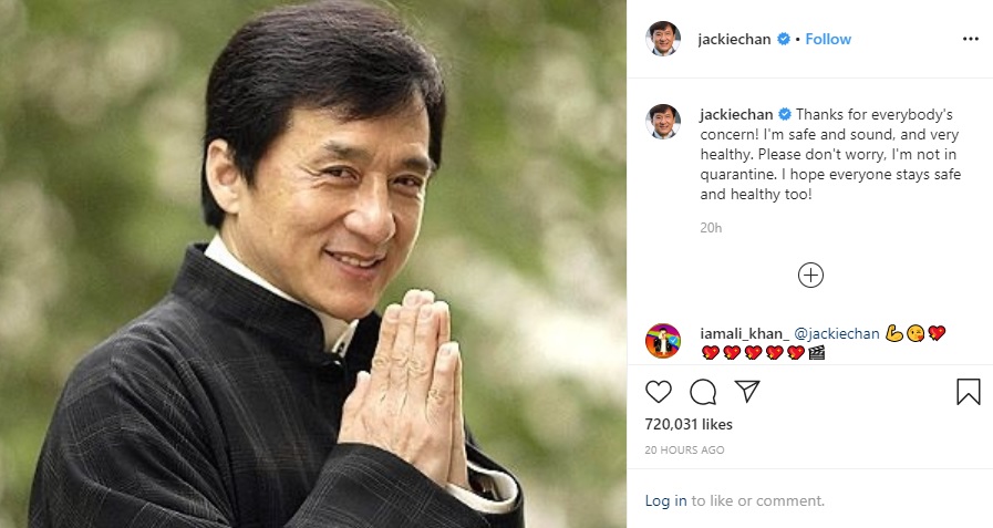 Жеки Чан олон нийтийн сүлжээгээр дамжуулан “Санаа тавьсанд баярлалаа. Би эрүүл энх байна. Би тусгаарлагдаагүй тул бүү санаа зовоорой. Та бүхэнд эрүүл энхийг хүсье” гэж бичсэн байлаа.