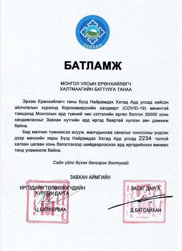 Монгол Улсын Ерөнхийлөгч Х.Баттулга өнгөрсөн долоо хоногт (2020.02.27) шинэ төрлийн коронавирусны халдвар дэгдээд байгаа хөрш БНХАУ-д албан ёсны айлчлал хийсэн. Энэ үеэр Ерөнхийлөгч Х.Баттулга Хятадын ард түмэн сэтгэл санааны хохирол амссан явдалд эмгэнэл илэрхийлж, Монголын ард түмнээс 30 мянган толгой хонь хандивласан. Тэгвэл төрийн энэхүү санаачилгыг Монголын иргэд дэмжиж, аймаг сумдаараа нэгдэн хандивын хонь өгсөөр байна.