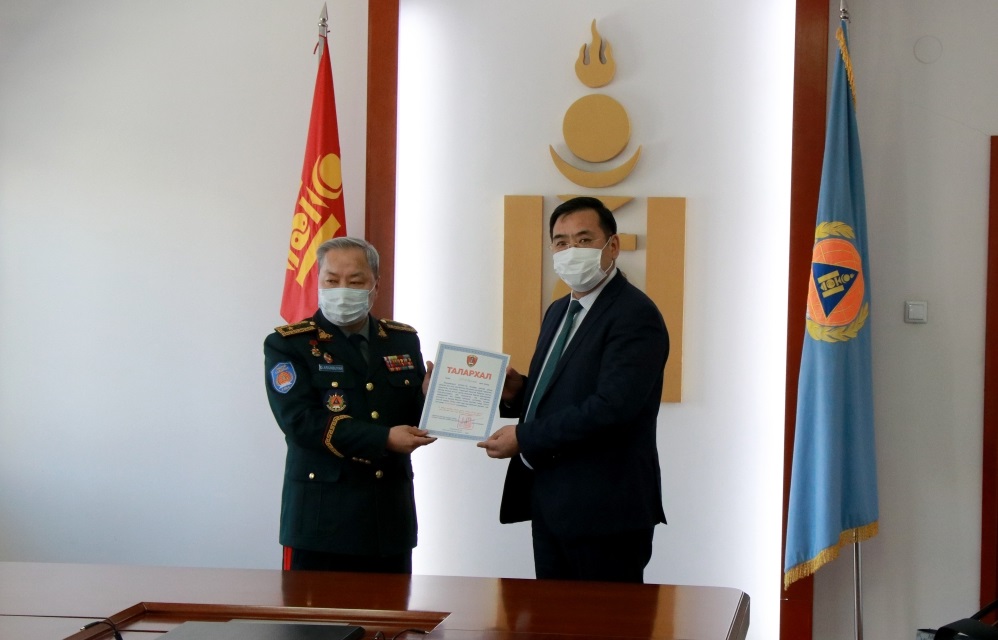 Монгол Улсын Зам, тээврийн хөгжлийн яамны ажилчид нэг өдрийн цалингаа Улсын Онцгой комисст хандивласныг өчигдөр /2020.03.13/ тус яамны Төрийн нарийн бичгийн дарга С.Батболд Улсын Онцгой комиссын Нарийн бичгийн дарга, ОБЕГ-ын Тэргүүн дэд дарга, Бригадын генерал Г.Ариунбуянд гардуулан өглөө.