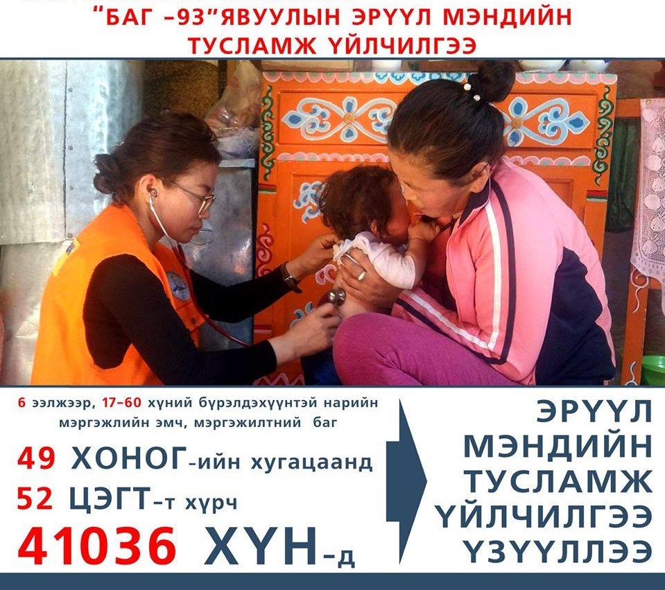 Төрөөс эрүүл мэндийн талаар баримтлах бодлого, аймгийн Засаг даргын үйл ажиллагааны хөтөлбөрийн хэрэгжилтийг хангах зорилгоор Увс аймгийн 18 сумын багийн иргэд, Улаангом сумын 12 багт “Баг-93” явуулын тусламж үйлчилгээг зургаан ээлжээр нарийн мэргэжлийн эмч, мэргэжилтэн 17-60 хүний бүрэлдэхүүнтэй баг нийт 49 хоног, 52 цэгт тусламж үйлчилгээг үзүүлсэн байна.