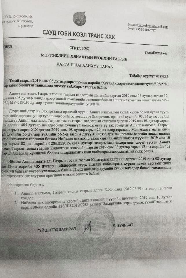 Мөн АМГТГ-ын Кадастрын хэлтсийн даргын 2019 оны наймдугаар сарын 12-ны өдрийн 405 дугаар шийдвэрийг хүчингүй болгуулж өгнө үү гэсэн гомдлыг АМГТГ-ын дарга Х.Хэрлэнд 2019 оны наймдугаар сарын 29-ний өдөр гомдол гаргасан гэдгээ мөн тайлбартаа дурджээ. Тэгэхээр “Сауд гоби коэл транс” ХХК-ийн эрх ашигтай холбоотой энэ мэдээллийг ч төрийн холбогдох байгууллага НАЙМАН САР хав даржээ.