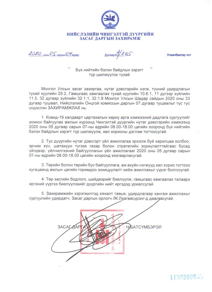 Төрийн болон төрийн бус байгууллага, аж ахуйн нэгжүүд хөл хорио тогтоох хугацаанд ажлын цагийн горимдоо зохицуулалт хийж ажиллана уу. Төр засгийн бодлого, шийдвэрийг биелүүлж, гамшгаас хамгаалах талаарх иргэний үүргээ биелүүлэхийг дүүргийн нийт иргэдэд уриалж байна.
