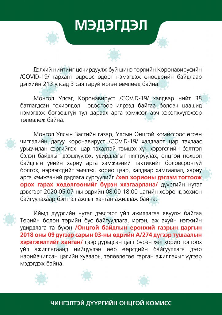 Ковид-19 халдварт цартахалын хариу арга хэмжээний дадлага сургуулийг зохион байгуулах ажлын хүрээнд Нийслэлийн Чингэлтэй дүүргийн Засаг даргын 2020 оны тавдугаар сарын 04-ний өдрийн “Бүх нийтийн бэлэн байдлын зэрэгт түр шилжүүлэх тухай” А/285 дугаар захирамжаар Чингэлтэй дүүргийн нутаг дэвсгэрийн хэмжээнд 2020 оны тавдугаар сарын 07-ны өдрийн 08:00-18:00 цагийн хооронд бүх нийтийн бэлэн байдлын зэрэгт түр шилжүүлж, хөл хорионы дэглэм тогтооно.