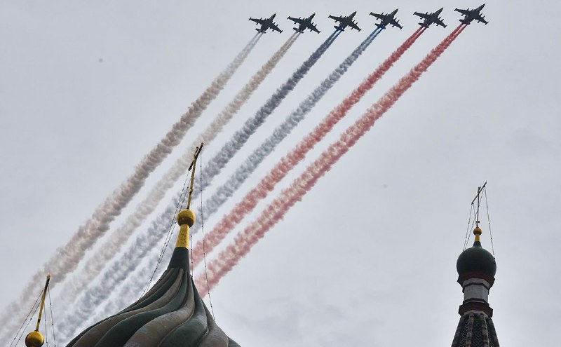Уламжлалт ёсоор “Русские витязи”, “Стрижи” оролцож, “ Су-25” онгоц Москва хотын тэнгэрийг улаан, цэнхэр, цагаан өнгийн тусгай утааны тусламжтай ОХУ-ын төрийн далбааны өнгөөр будаж, жагсаалыг өндөрлүүлжээ.