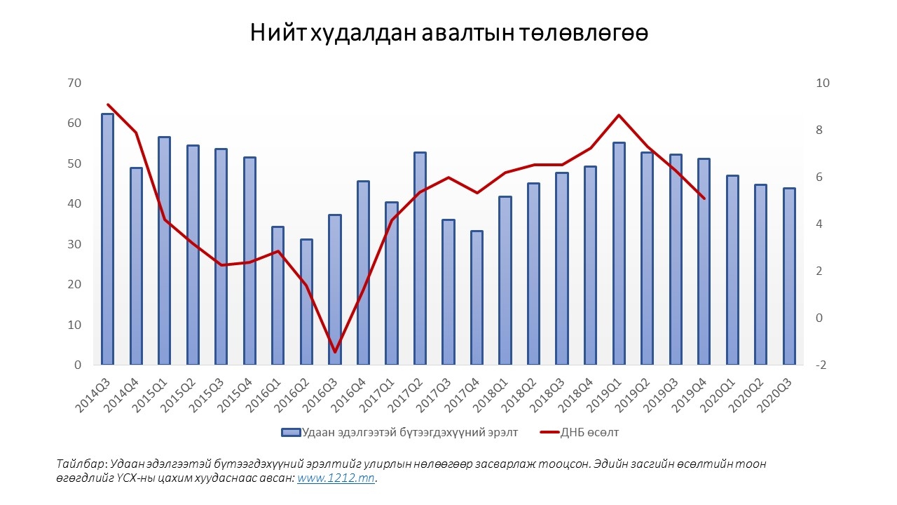 Удаан эдэлгээтэй бүтээгдэхүүний төлөвлөлтийг хоёр улирлын дараах ДНБ-ий өсөлтийн динамиктай харьцуулсныг зурагт харууллаа.