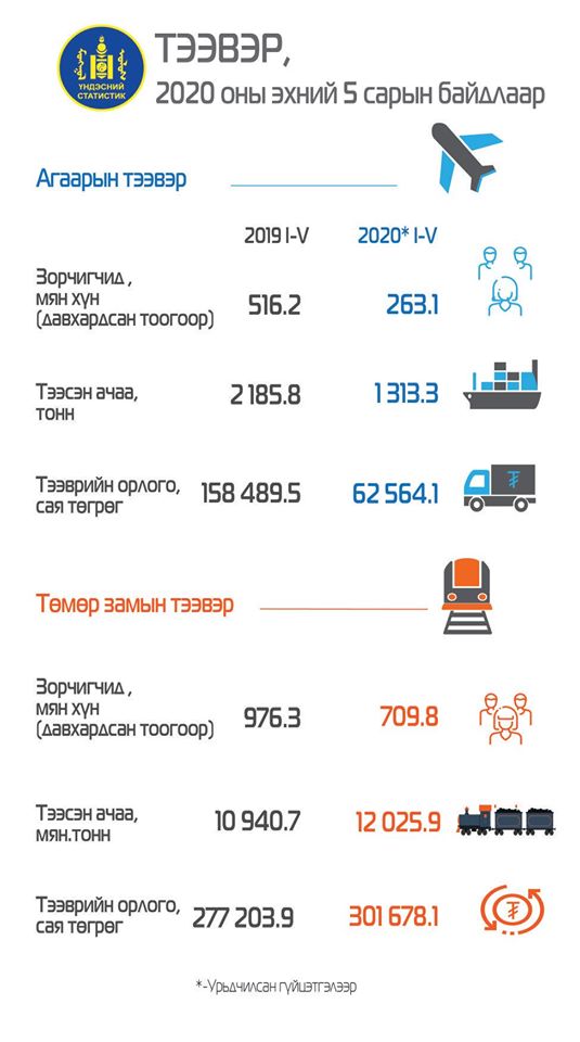 Харин олон улсад тээсэн ачаа 1.3 мянган тонн болж, өмнөх оны мөн үеэс 874.4 тонноор буурчээ. Агаарын тээврээр тээсэн ачаа тавдугаар сард 119 тонн болж, өмнөх сараас 8 тонноор өссөн байна.