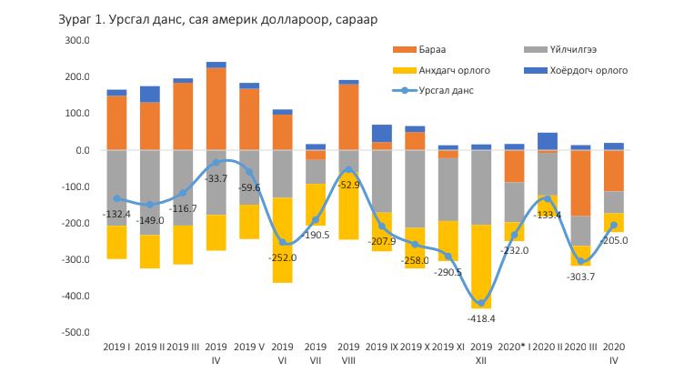 Харин дөрөвдүгээр сард урсгал данс 205 сая ам.долларын алдагдалтай гарч өмнөх сараас 98.7 сая ам.доллароор буурчээ.
