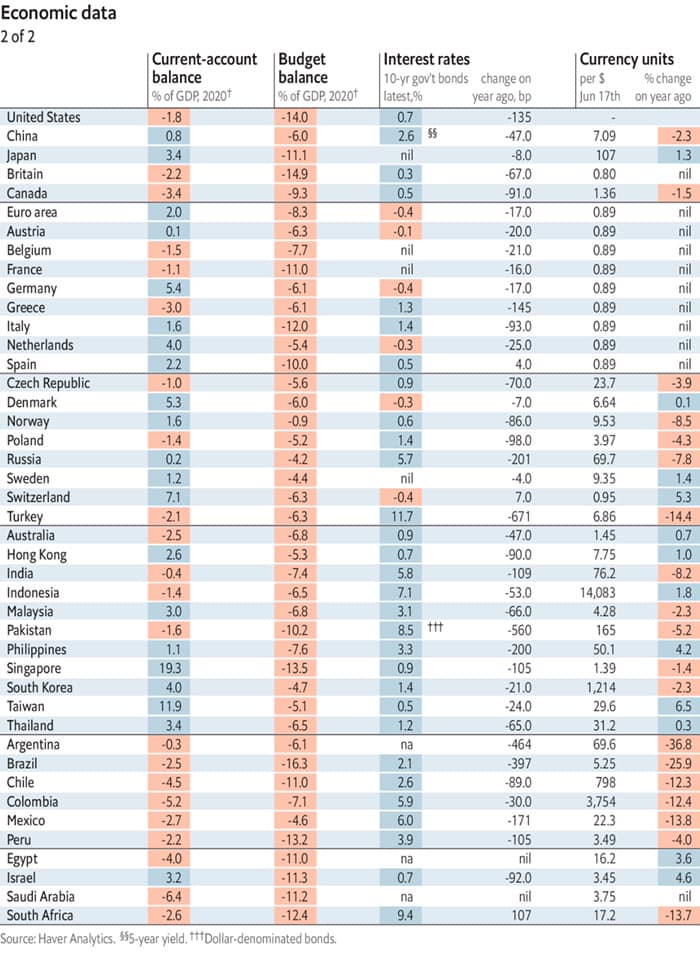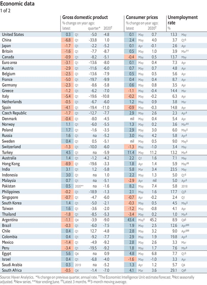 2020 оны хувьд Хятад, Индонез, Египетийн эдийн засаг 1 очирм хувийн өсөлттэй. Харин бусад орнуудад эдийн засаг нь агшихаар байна. Турк, Аргентинаас бусад оронд инфляц маш бага түвшинд гарахаар төсөөлжээ. Ажилгүйдлийн түвшин АНУ, Канад, Грек, Испани, Турк, Энэтхэг, Филлипин, Бразил, Колумб, Өмнөд Априк зэрэг орнуудад ажилгүйдэл хэт өндөр түвшинд хүрчээ.