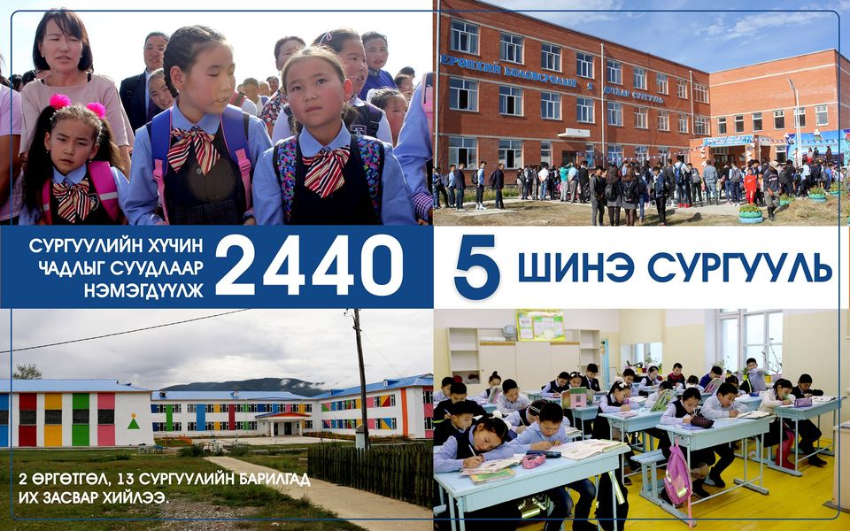 Увс аймгийн Засаг даргын 2016-2020 оны үйл ажиллагааны хөтөлбөрт тусгагдсны дагуу хөдөө сум багийн хүүхэд багачуудын сурч боловсрох таатай орчинг бүрдүүлэх зорилтын хүрээнд Увс аймагт өнгөрсөн 4 жилийн хугацаанд 5 шинэ сургууль шинээр барьж, 2 сургуульд өргөтгөл, 13 сургуульд их засвар хийжээ. Үүний үр дүнд сургуулийн хүчин чадал 2440 суудлаар нэмэгдсэн байна.