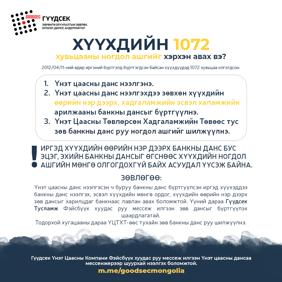 Харин 1072 хувьцаатай эсэх, үнэт цаасны данстай эсэхээ дараах хаягт хандан шалгаарай www.goodsec.mn/check