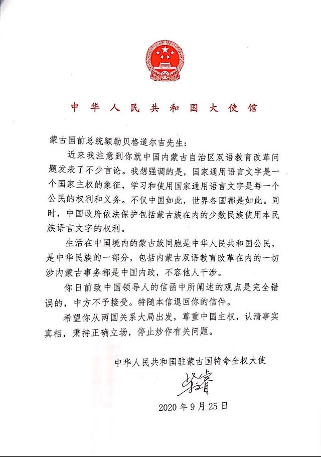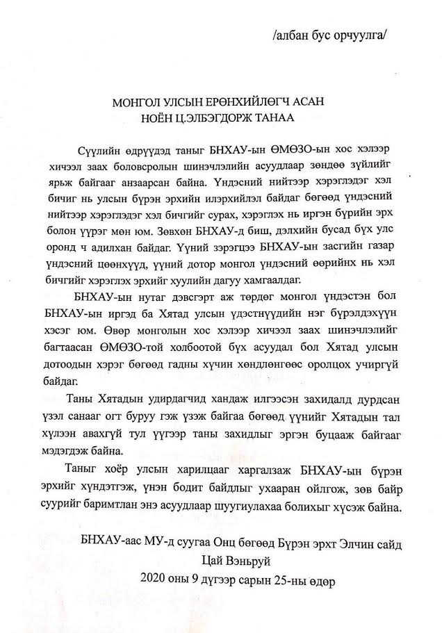 Монгол Улсын Ерөнхийлөгч асан Ц.Элбэгдорж БНХАУ-ын дарга Си Жиньпинд хандан захидал илгээсэн гэж өөрийн цахим хуудсаар мэдэгдэж байсан бол Монгол дахь БНХАУ-ын Элчин сайд Цай Вэньруй өчигдөр (2020.09.25) уг захидлыг хятадын тал хүлээн авах боломжгүй гэсэн хариуг өгчээ.