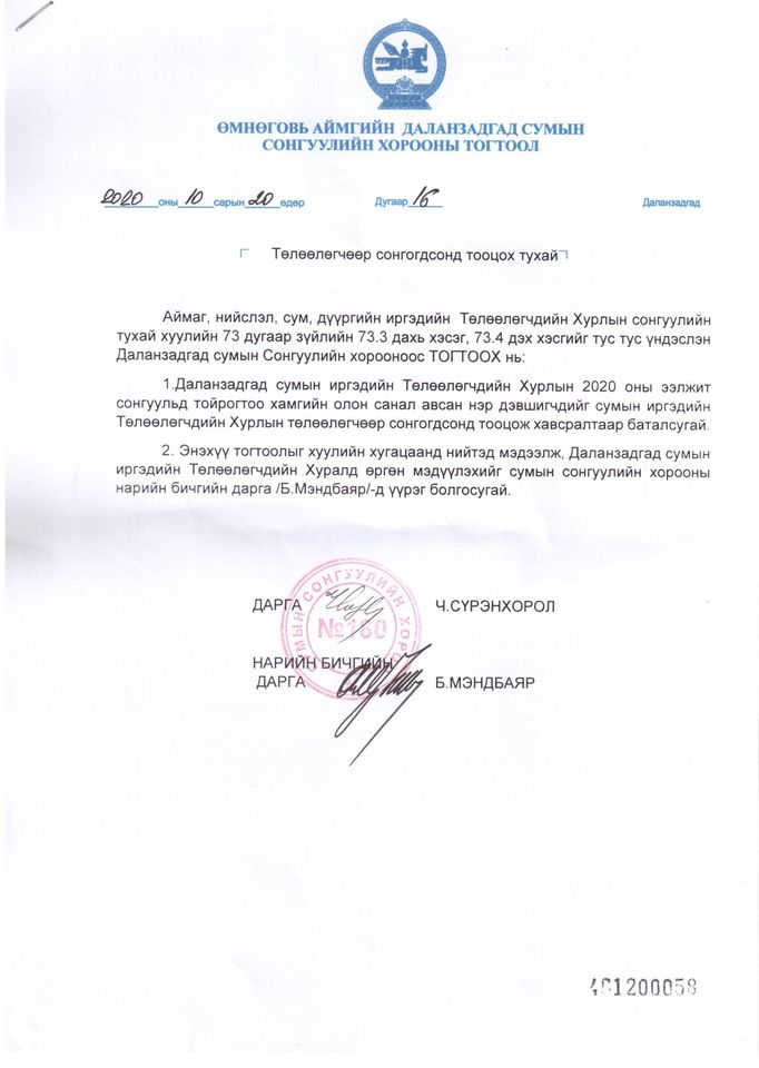 Тэгвэл өнөөдөр Даланзадгад сумын Сонгуулийн хорооноос тогтоол гаргаж, тойрогтоо хамгийн олон санал авсан нэр дэвшигчдийг Даланзадгад сумын Иргэдийн төлөөлөгчдийн хурлын Төлөөлөгчөөр сонгогдсонд тооцож, нэрсийг нь баталсан байна. Улмаар энэхүү тогтоолыг Даланзадгад сумын Иргэдийн төлөөлөгчдийн хуралд өргөн мэдүүлэх болжээ.