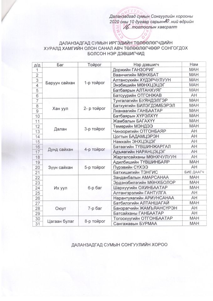 Өмнөговь аймгийн Даланзадгад сумын Иргэдийн төлөөлөгчдийн хурлын 2020 оны ээлжит сонгуулийн санал хураалт энэ сарын 15-нд болж, нийт 31 төлөөлөгч шинээр сонгогдсон.