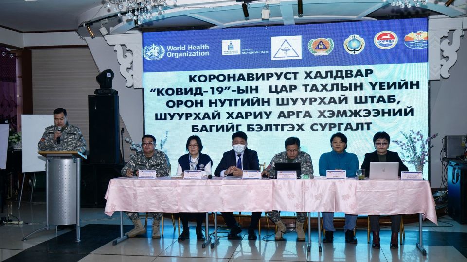 Ажлын хэсэгт ЭМЯ, ОБЕГ, ХӨСҮТ, АШУҮИС болон ДЭМБ-ын мэргэжилтнүүд багтаж байгаа бөгөөд “COVID-19”-ын цар тахлын үеийн орон нутгийн шуурхай штаб, шуурхай хариу арга хэмжээ авах багийн гишүүдийг бэлтгэх сургалтыг зохион байгуулж байгаа юм.