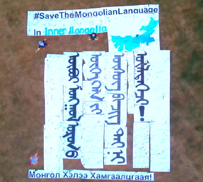 Э.Алтаншагай болон түүний хэсэг нөхөд 9.2 метр өргөн, 14.2 метр урт даавуун дээр “Өвөр Монгол ороны үг хэлийг, үсэг бичигтэй нь үлдээгээч” гэж бичин дроноор бичлэг хийн сошиал хуудаст тавьжээ.