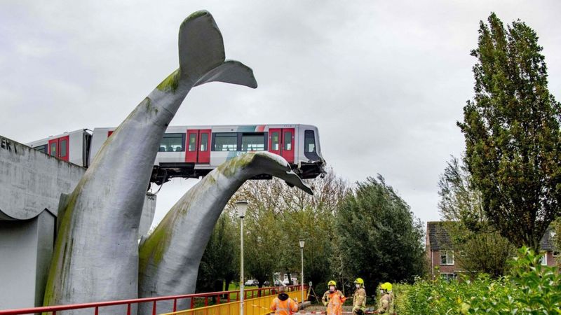 Нидерландын метроны галт тэрэг замын төгсгөлд зогсож чадаагүйн улмаас өндөр гүүрнээс унах дөхжээ. Галт тэрэгний жолоочийг халимны сүүлний хэлбэр бүхий аварга том хөшөө аварсан байна. Галт тэрэгний бүрэлдэхүүн халимны сүүлэн хэсэгт тогтож үлджээ.