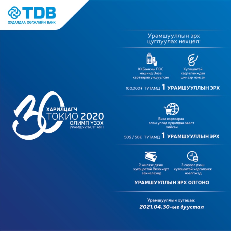 Харин энэ есдүгээр сард ОУОХ-оос зуны 32 дахь удаагийн олимпын их наадам 2021 оны долоодугаар сарын 23-наас наймдугаар сарын 08-ны өдрийг дуусталх хугацаанд зохион байгуулагдана гэдгийг албан ёсоор зарласан юм. Үүнтэй холбогдуулж Худалдаа, хөгжлийн банк хойшлуулаад байсан "ЗҮРХНЭЭСЭЭ ДЭМЖЬЕ" урамшуулалт аяны тохирлоо явуулж, эхний зургаан харилцагчаа тодруулаад байна.