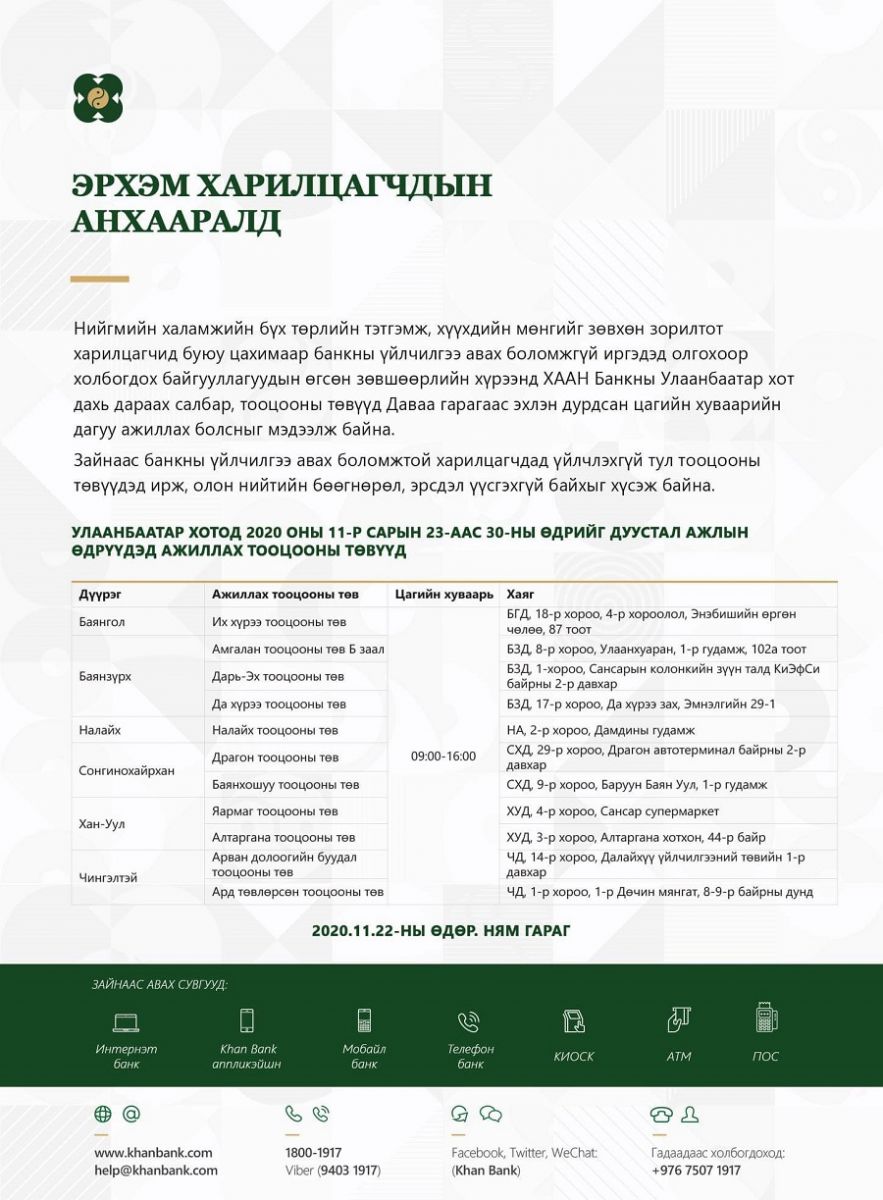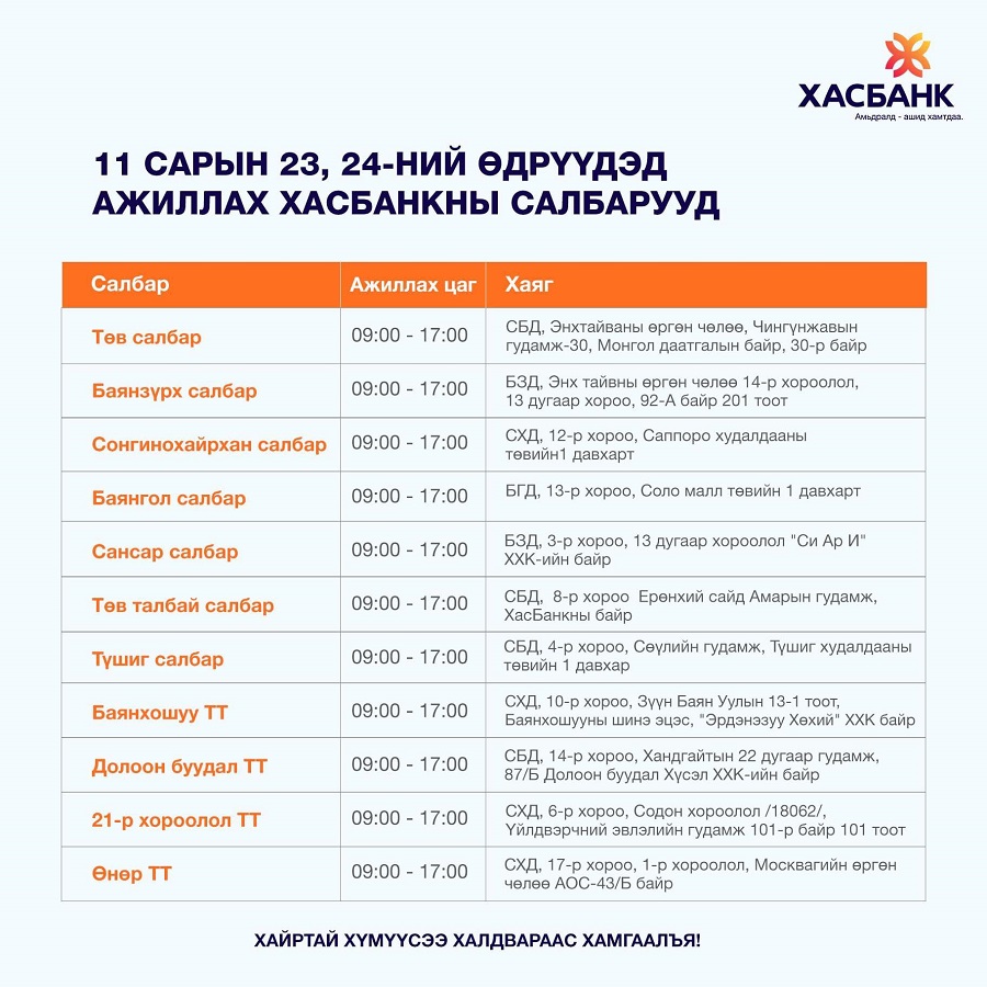 Тэгвэл арваннэгдүгээр сарын 23-ны өдрөөс буюу маргаашнаас эхлэн Хас банк, Хаан банк, Төрийн банкууд 09:00-16:00 цагийн хооронд ажиллаж эхлэхээр болжээ.