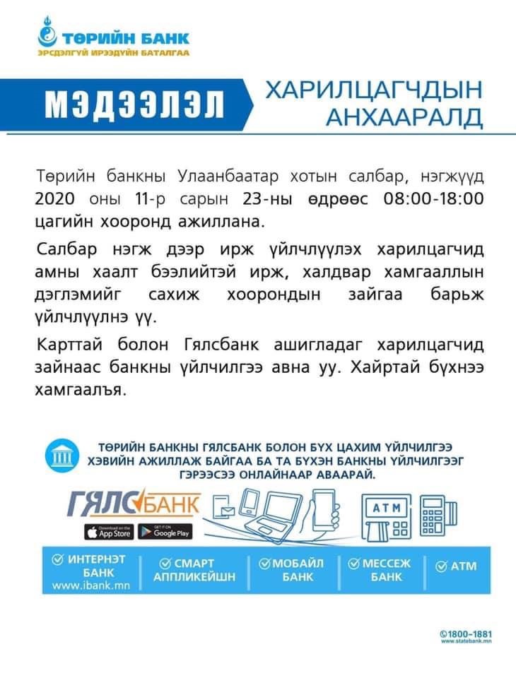 Харин Худалдаа хөгжлийн банк болон Голомт банк Улсын онцгой комиссоос гаргасан шийдвэрийн дагуу арванхоёрдугаар сарын 01-ний өдрийг хүртэл ажиллахгүй байх хуваарьтай байна.