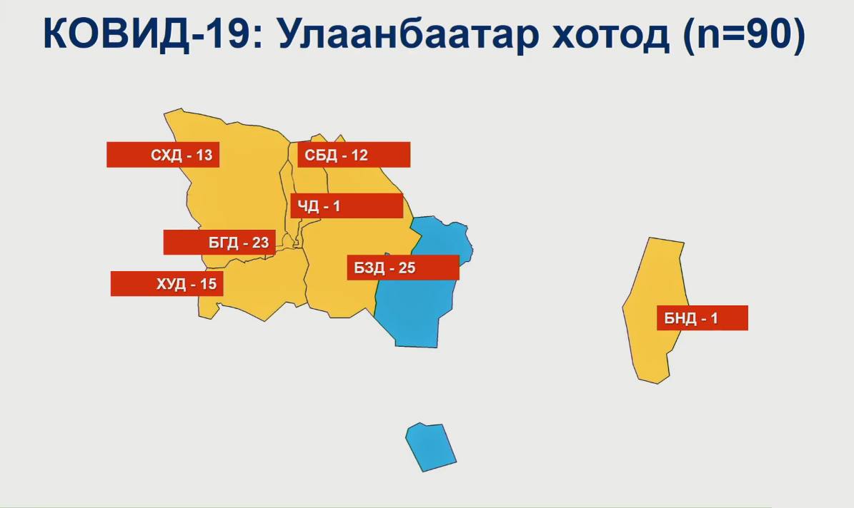 - Нийт батлагдсан тохиолдол 90. Эдгээрийн ойрын хавьтал 1067 хүн байгаагаас 1063 хүнийг шинжилгээнд хамруулж, шинжилгээ үргэлжилж байна. Хоёрдогч хавьтлын тоо 17619 байгаагаас бүгд шинжилгээнд хамрагдсан, одоогоор халдвар илрээгүй.