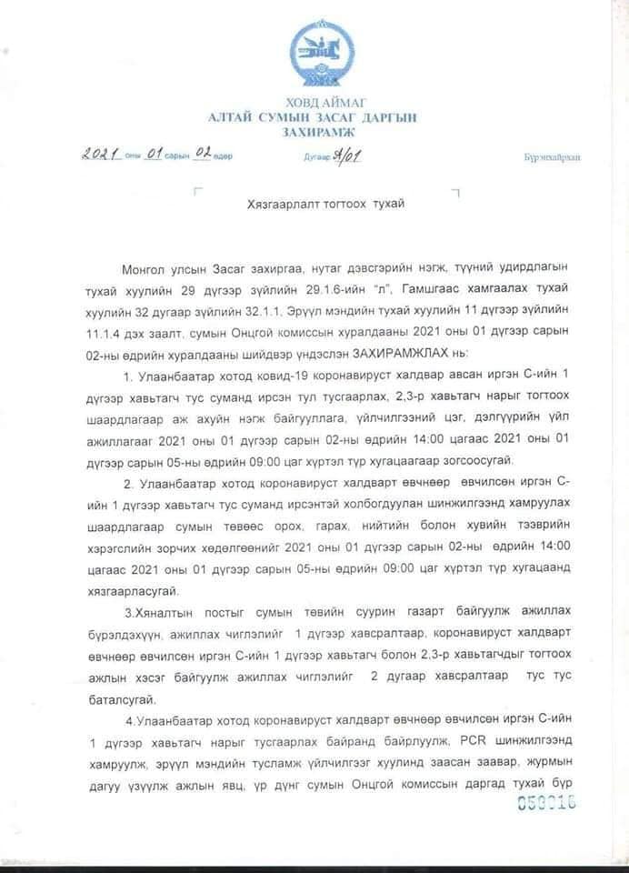 Ховд аймгийн Алтай сумын Засаг дарга захирамж гаргаж, Улаанбаатар хотод коронавирусний халдвар авсан иргэний нэгдүгээр хавьтал тус суманд ирсэнтэй холбоотойгоор нэгдүгээр сарын 5-ныг хүртэл хязгаарлалт тогтоожээ.