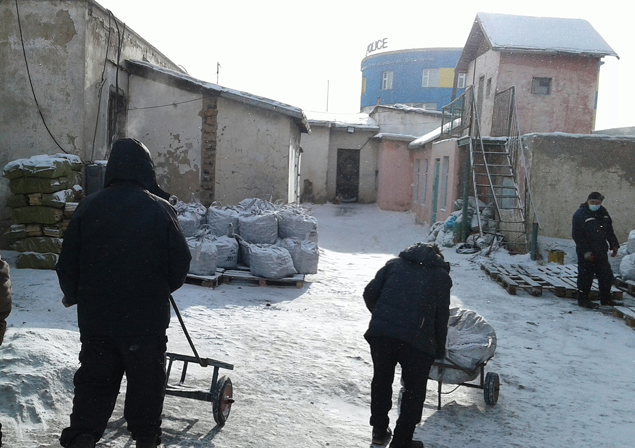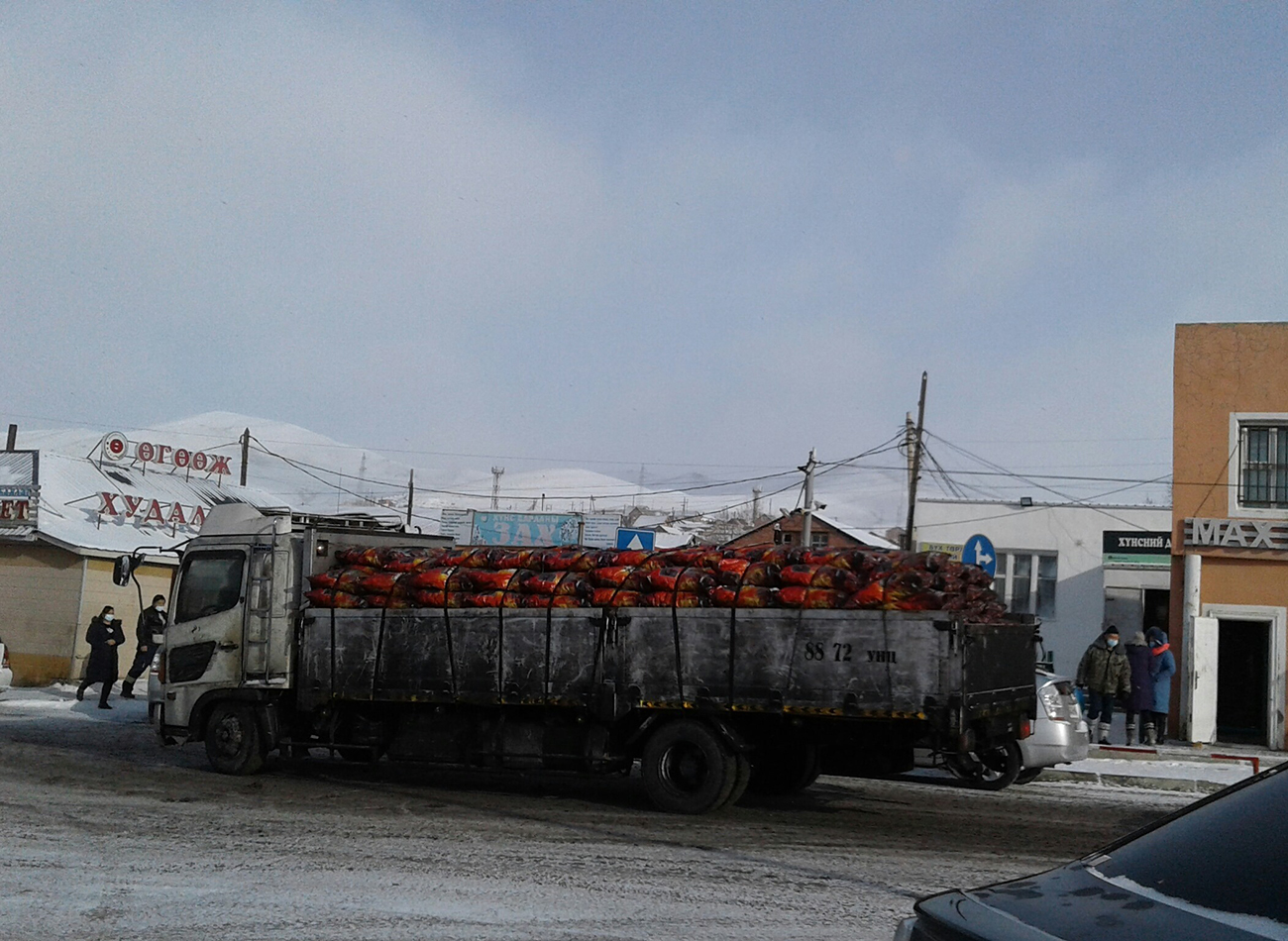 Миний бие ч хорооноос гарч түлшний цэгүүдийн байдлыг сонирхохоор цааш явав. Зарим цэгт 25 кг-ын улаан шуудайтай түлш дууссан, 100 кг-аар савласан цагаан ууттай нь л үлджээ. Саяхнаас уутны хүрэлцээ муудсан гэсэн шалтгаанаар 100 кг-аар савласан түлш нийлүүлэх болсон юм. Айл болгонд бөх тэх хүн байдаггүй учраас түүнийг дийлж ачаад гэртээ хүргэнэ гэдэг хүнд даваа. Бөх барилддаг байсан дарга нар зовлонг нь мэдэхгүй байж мэднэ. Тэр тусмаа өвгөд настан, хүүхэд, хүүхнүүд голдуу түлшиндээ явж харагддаг шүү дээ. Ойр гэртэй нь усны төмөр тэргэн дээр 25 кг-ын хоёр, гурван ууттайг тавьж зүтгэж харина. Жижиг ууттай түлш дууссан цэгээс ганц нэг залуус 100 кг-ын түлшийг усны тэргэн дээр хоёул гурвуул нийлж өргөн тавиад зүтгэх боловч шинэхэн хялмаа буусан налуу газар өөд түрж дийлэхгүй халтирч гулган зүдэрч байгаа харагдана. Хүч хүрэхгүй нэг нь сүүлд ирэхээр буцаж байв. Тэвш дүүрэн түлш ачсан машин харагдаж баярлуулсан ч өөр холын цэг рүү явж байгаа ажээ.