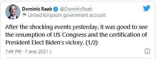 Британийн Гадаад харилцааны сайд Доминик Рааб пүрэв гарагт мэдэгдэл хийхдээ, хүчирхийлэл үйлдэж буй цөөнхийн зүгээс ардчилсан хүсэл зоригийн илэрхийлэлд саад учруулж чадахгүй гэдгийг онцлон тэмдэглэв. Тэрбээр “Өчигдрийн цочирдом явдлуудын дараа АНУ-ын Конгресс үйл ажиллагаагаа сэргээн, шинээр сонгогдсон ерөнхийлөгч Байдены ялалтыг батламжлахыг баяртайгаар харлаа. Энэ нь Америкийн ард түмний ардчилсан хүсэл зориг нь хүчирхийлэл үйлдэгч цөөнхөөс болж ямар нэгэн асуудалд орж, шантрах ёсгүй гэдгийг илтгэсэн чухал дохио болж байна. Өчигдрийн хүчирхийллийг Их Британийн зүгээс үг дуугүй буруушааж байгаа” хэмээн Твиттер хуудсандаа бичжээ.
