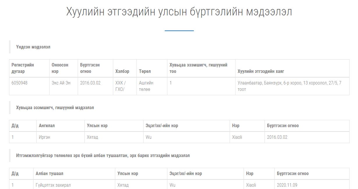 -БНХАУ-ын хөрөнгө оруулалттай “Экс Ай Эн” гэх компанийн нэр дээр бүртгэлтэй байх ба даатгалаа тогтмолоо хийлгэж, татвараа төлж байжээ.