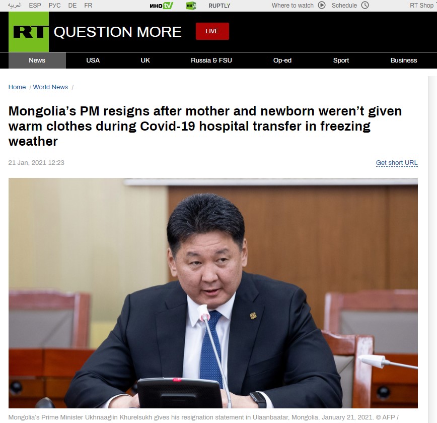 Russia Today: Өвлийн хүйтэнд дулаан хувцас өмсүүлэлгүй эх, үр хоёрыг шилжүүлсний дараа Монгол Улсын Ерөнхий сайд огцорлоо