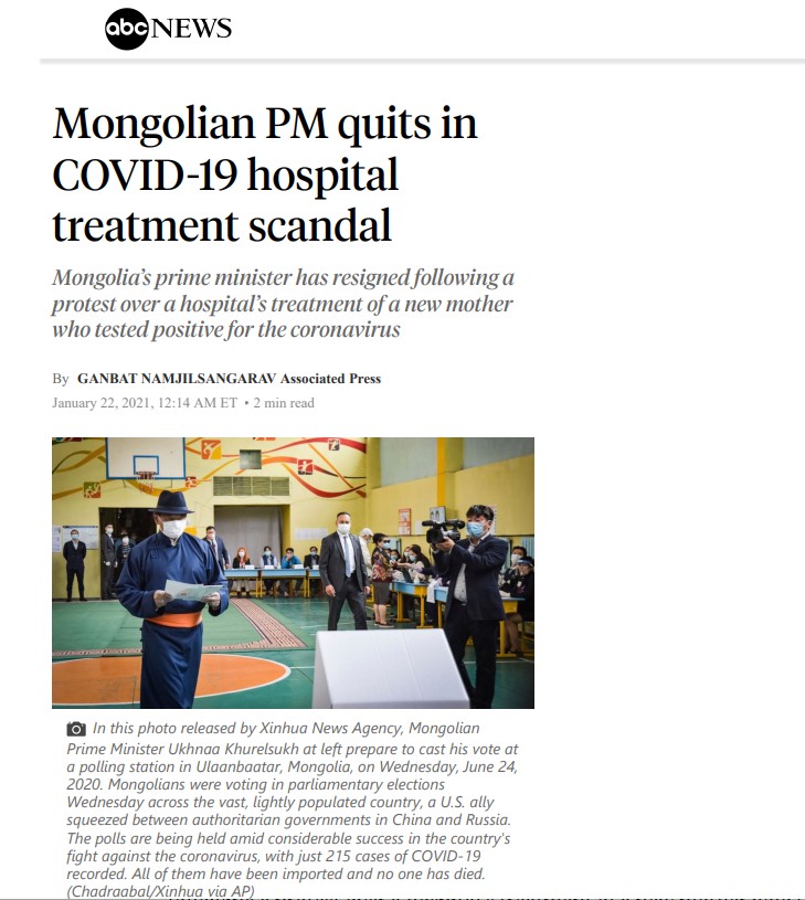Associated Press: “Ковид-19” эмнэлгийн асуудлаас шалтгаалан Монгол Улсын Ерөнхий сайд огцорлоо