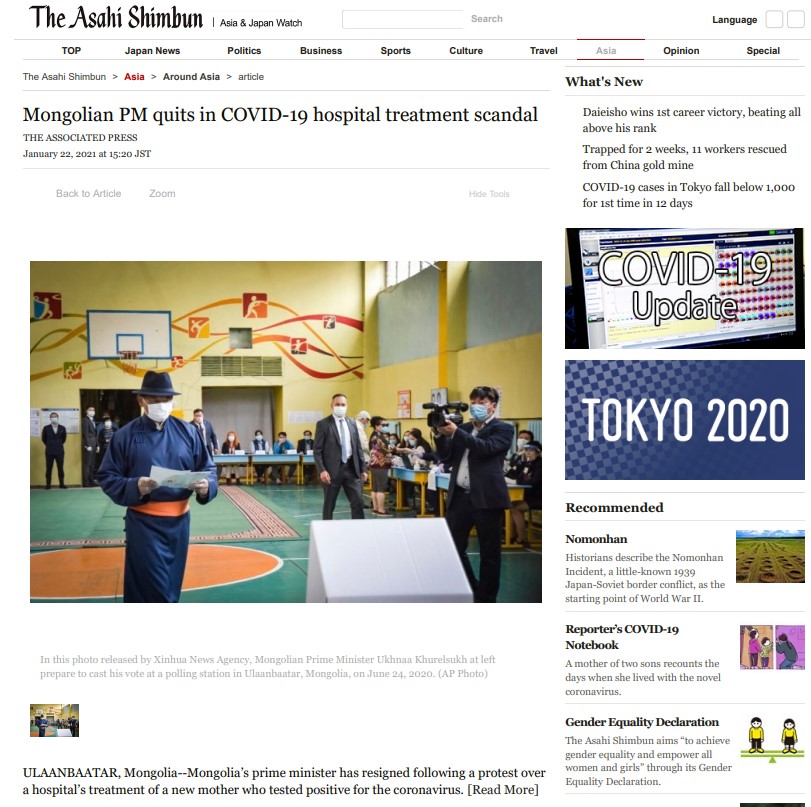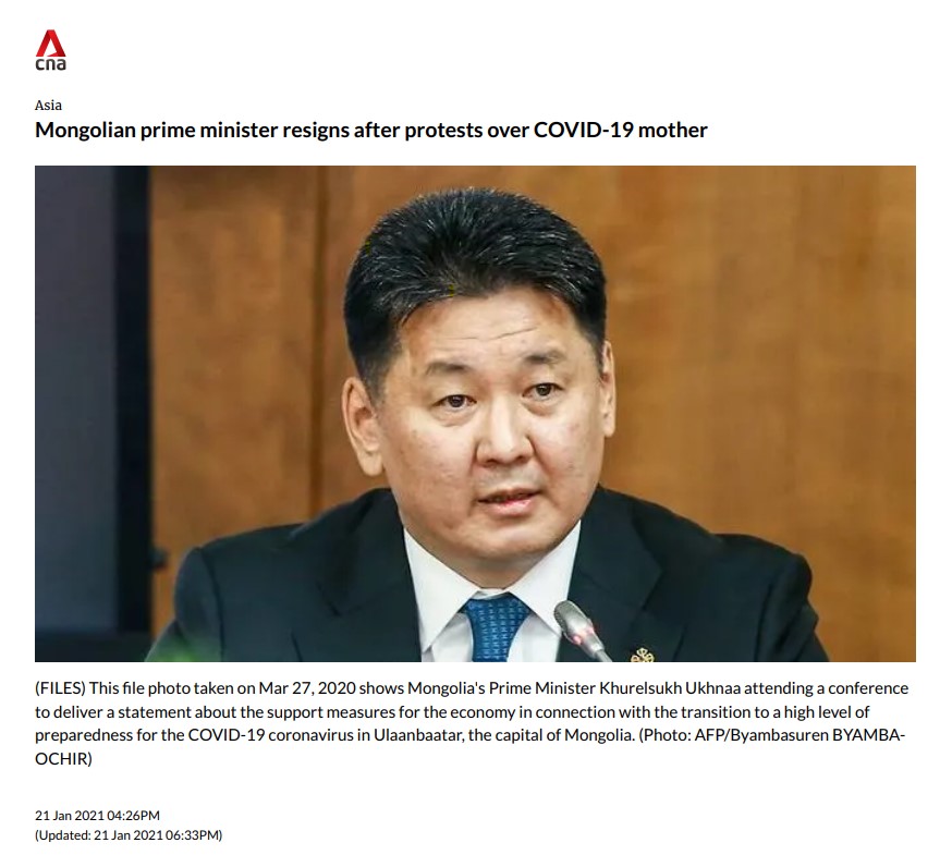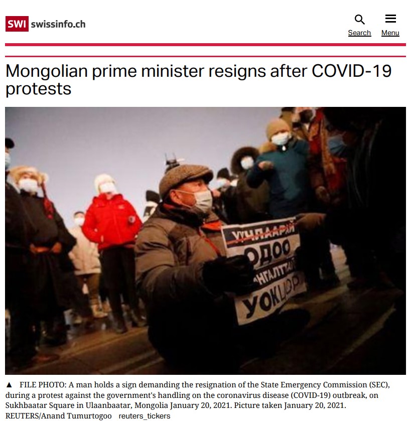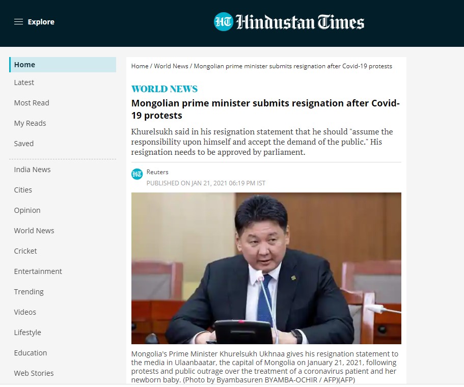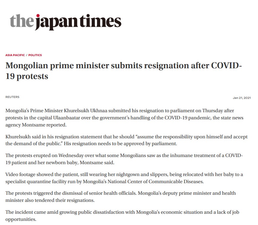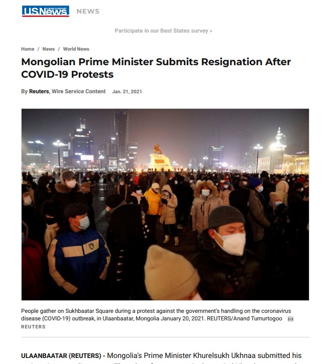 Монгол Улсын Ерөнхий сайд өөрийн хүсэлтээр огцроод яг дөрөв хонож байна. Цар тахлын үед гаргасан хүний эрхийн зөрчил, түүнээс үүдсэн иргэдийн тэмцэл Засгийн газрыг хэрхэн огцруулсан тухай дэлхийн 20 орчим хэвлэл мэдээллийн хэрэгсэл онцолжээ.