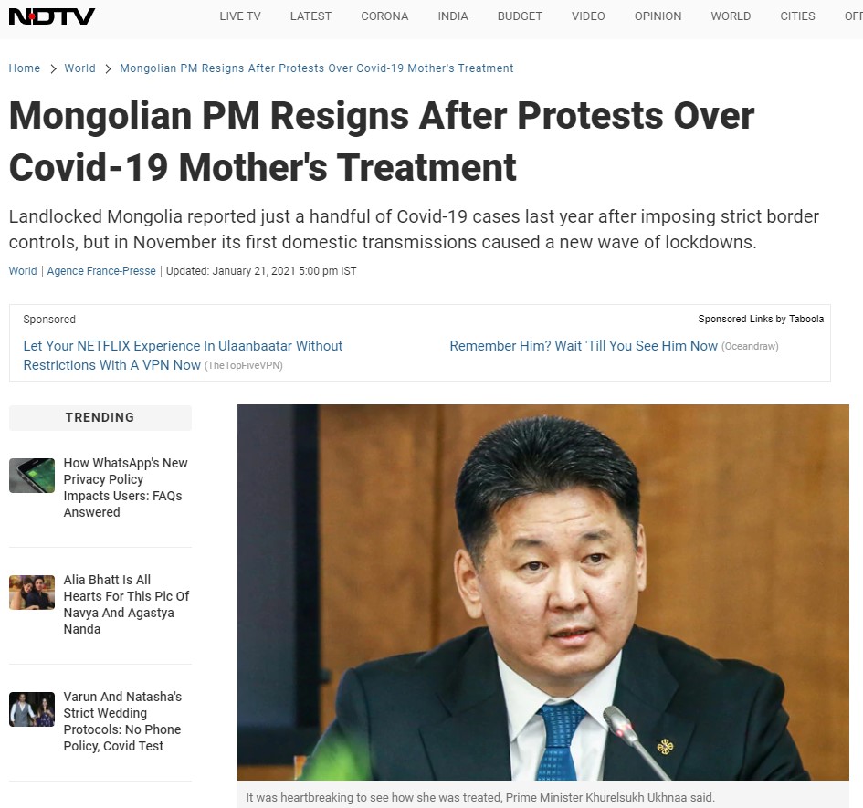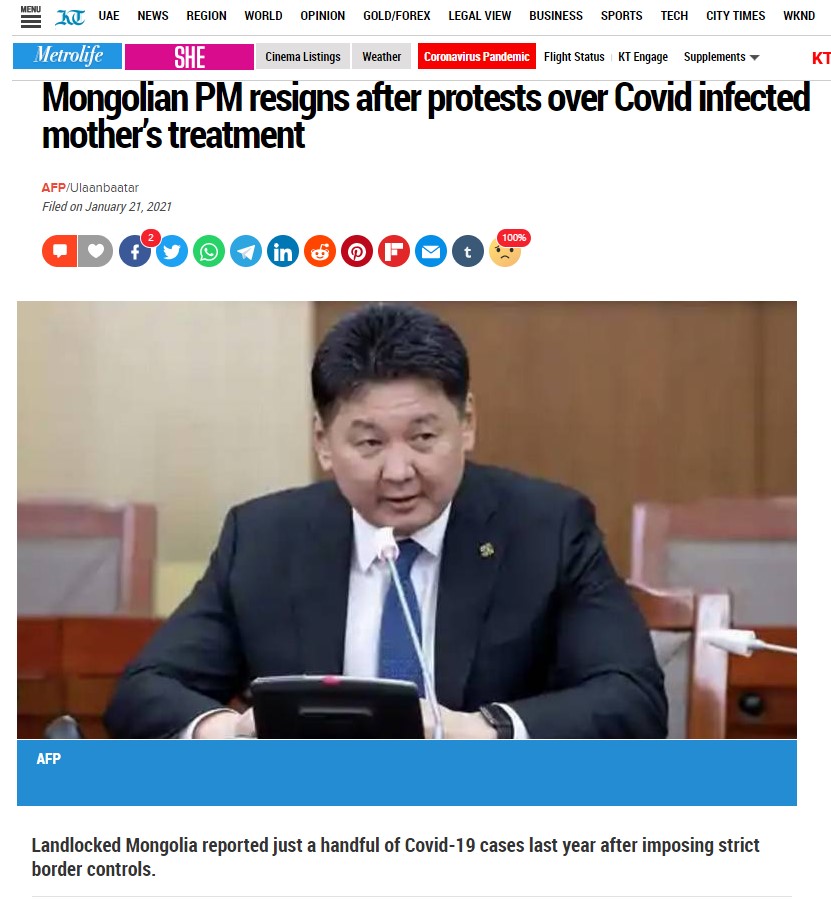 Монгол Улсад коронавирустэй дөнгөж төрсөн эхийг, нярайн хамт өөр эмнэлэг рүү шилжүүлэх тээвэрлэлтийн үеэр хүний эрхийг ноцтой зөрчсөн үйлдэл болж, улмаар эсэргүүцлийн жагсаал өрнөж, Монгол Улсын Ерөнхий сайд огцорлоо.