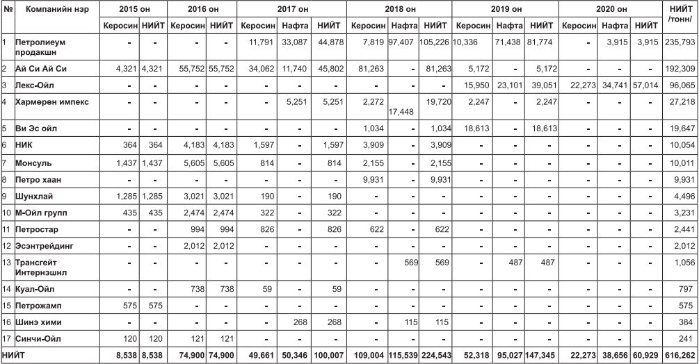 Монгол Улс 2015-2020 оны дөрөвдүгээр сарыг хүртэл 616.262 тонн хагас боловсруулсан нефтийн бүтээгдэхүүн импортолсон. Тэдгээрийг оруулж ирсэн 17 компанийн жагсаалттай танилц. Үүнээс “Петролиум продакшн” болон “Ай Си Ай Си” гэх хоёр компанийг онцлох хэрэгтэй. Энэ хоёр компани нийт импортолсон керосин, нафтагийн 85 хувийг дангаараа оруулж ирсэн байна. Үүн дотроо Эрдэнэт хотод байрладаг “Петролиум продакшн” компани зэс угаах үйлдвэрт керосин нийлүүлдэг гэх ч үнэн хэрэгтээ хэрэглээнээсээ хэт давсан хэмжээний химийн бүтээгдэхүүн оруулж ирсэн нь салбарынхны анхааралд өртжээ. Мөн нэрээ нууцлахыг хүссэн хэд хэдэн эх сурвалж хуурамч шатахууны сүлжээ “Петролиум продакшн” компаниас эхтэй гэдгийг хэлж байгаа юм.