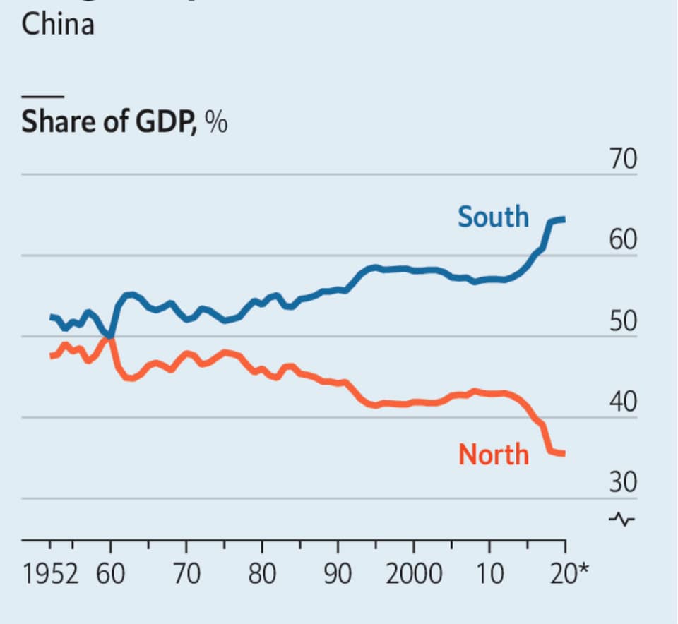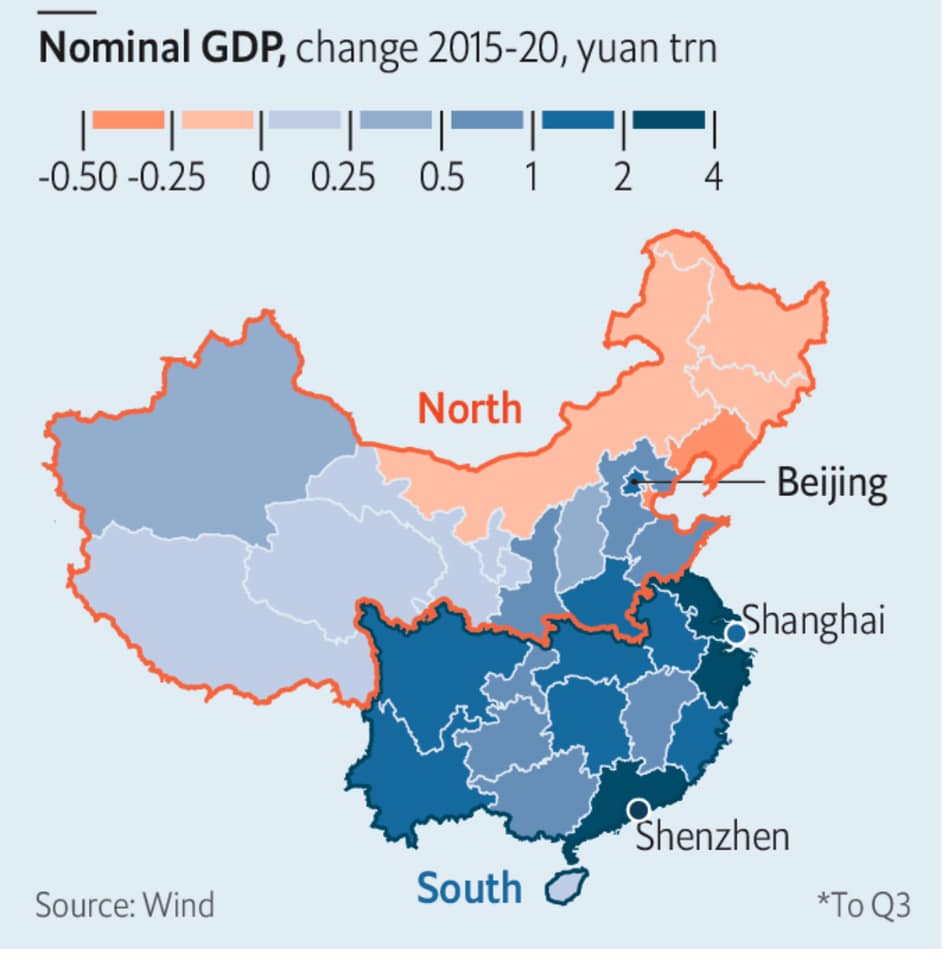 Гэхдээ сүүлд The economist сэтгүүлд гарсан мэдээгээр Хятадын бүс нутгийн ДНБ-ий өсөлт бүс нутгаар ялгаатай буюу манай улстай хиллэдэг, худалдаа түлхүү хийдэг хойд (North) бүс нутгийн ДНБ-д эзлэх хувь 2015 оноос хойш илт буурч байгаа бол өмнөд (South) бүс нутгийн ДНБ-нд эзлэх хувь нэмэгджээ.