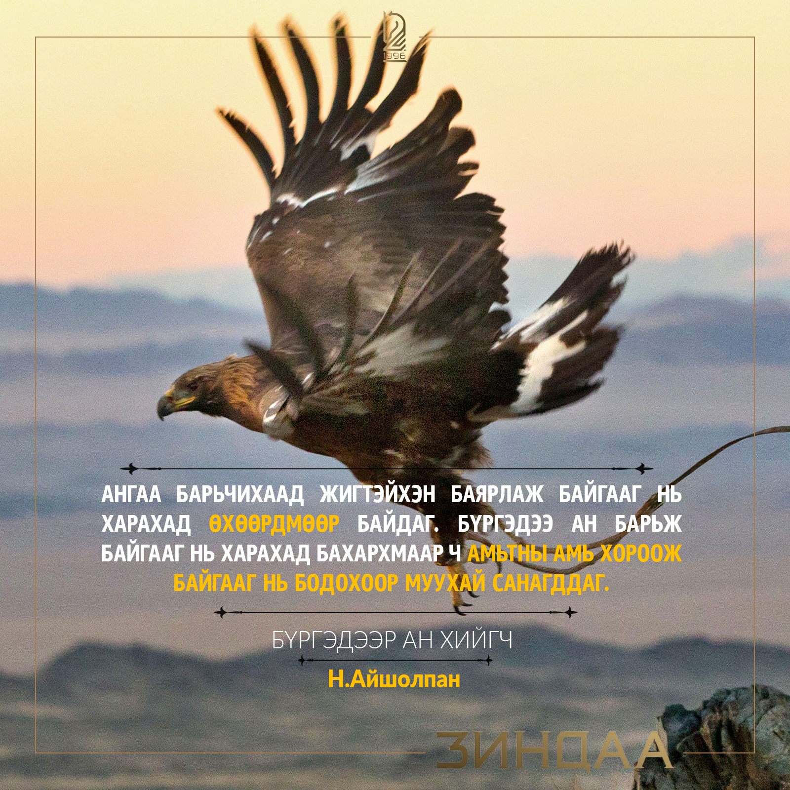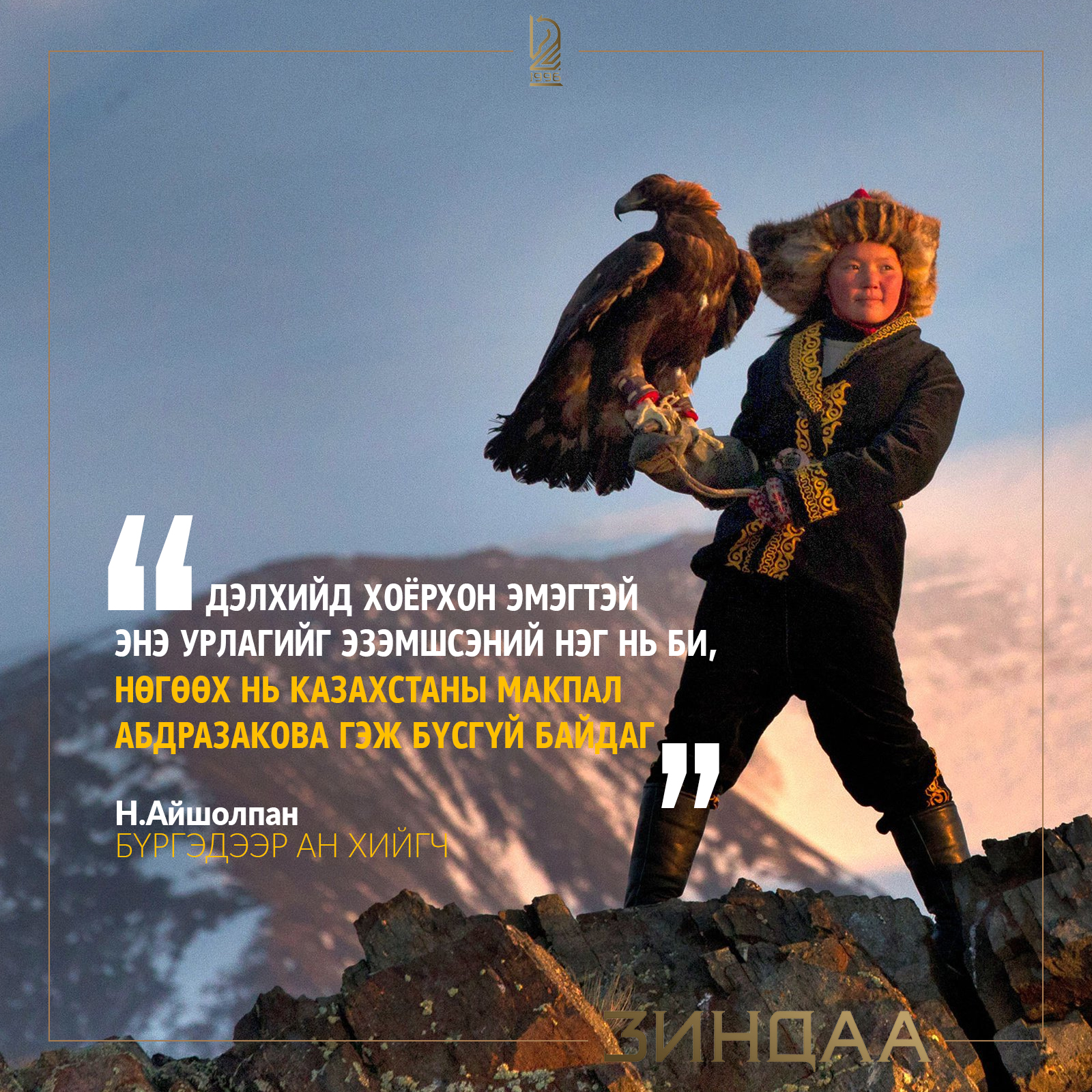 Монголыг дэлхийд таниулж буй аливаа өгөгдөл бүрийг бид уухайлан түрэх, уриалан алдаршуулах учиртай. “Зиндаа" сэтгүүлийн "Дэлхийн Монгол” булангийн зорилго, утга учир үүнд оршдог. 2017 оны “Оскар”-ын наадмын баримтат киноны төрөлд шилдэг 15-д багтсан “The Eagle Huntress” киноны гол дүр, бүргэдчин охин Нургайвын Айшолпаныг ""Дэлхийн Монгол" булан тухайн үед онцолж байсан юм. Наурызын баяр тохиож буй энэ өдөрт зориулан АРХИВААС түүний ярилцлагыг онцлон, дахин нийтэлж байна.
