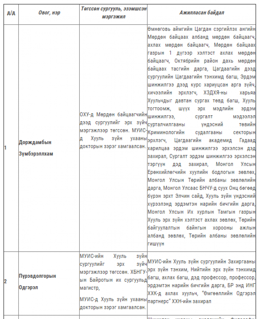 Үндсэн хуулийн цэцийн гишүүнд нэр дэвшүүлэхээр ирүүлсэн иргэдийн мэдээллийг “Монгол Улсын дээд шүүхийн нийт шүүгчийн хуралдаанаар хэлэлцэх зарим асуудлын бэлтгэл хангах журам”-ын 4 дүгээр зүйлийн 4.6 дахь хэсэгт заасны дагуу олон нийтэд нээлттэй мэдээлж байна.