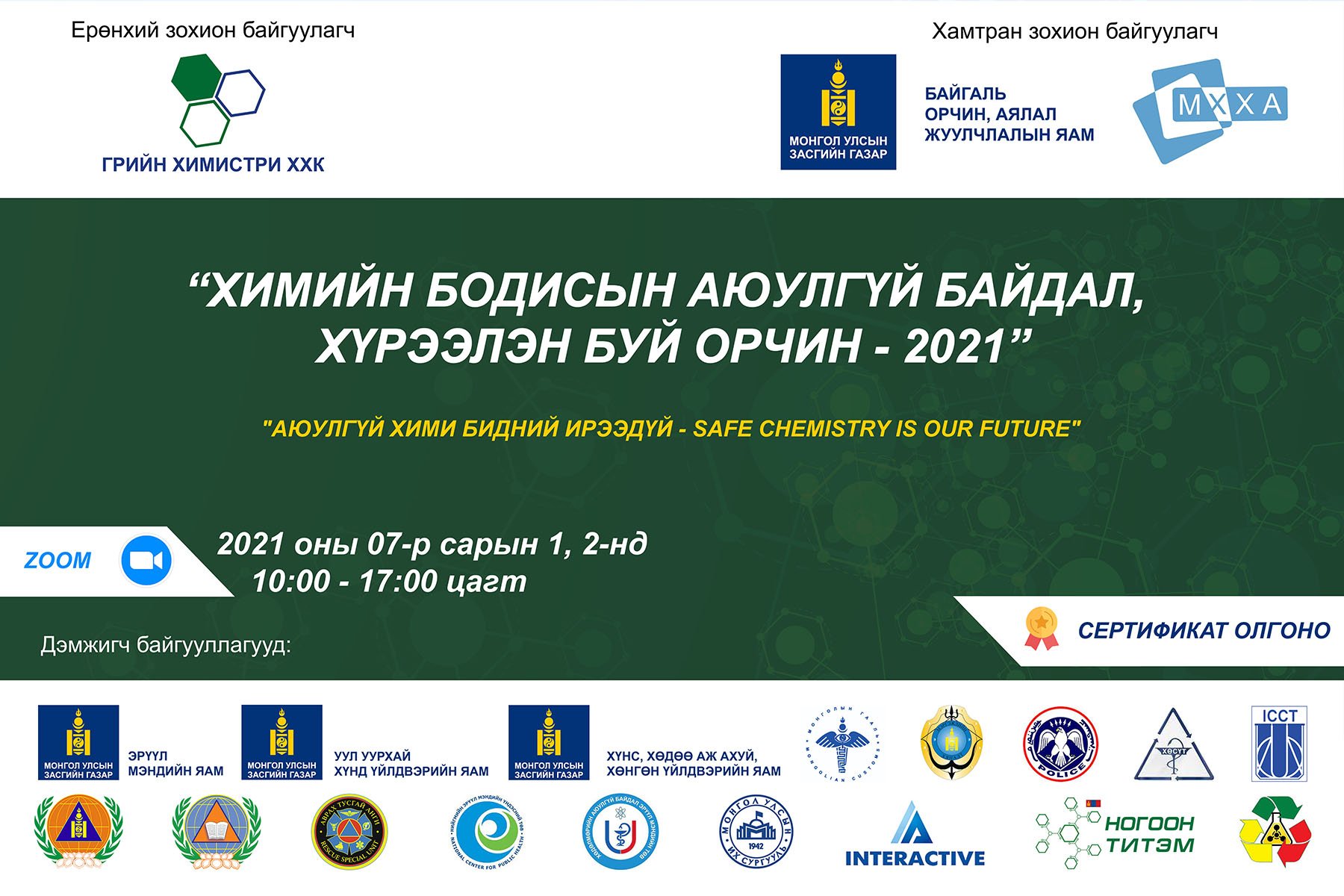 “Грийн химистри” ХХК-иас санаачлан БОАЖЯ, МХХА ТББ-тай хамтран химийн салбарын бүх төрийн болон төрийн бус компани, ААНБ-ууд, тэдгээрийн ажилтнуудын хууль, эрх зүйн боловсрол, мэдлэг, мэдээллийг дээшлүүлэх зорилгоор“Химийн бодисын аюулгүй байдал, хүрээлэн буй орчин-2021” сэдэвт онлайн сургалт, семинарт урьж байна.