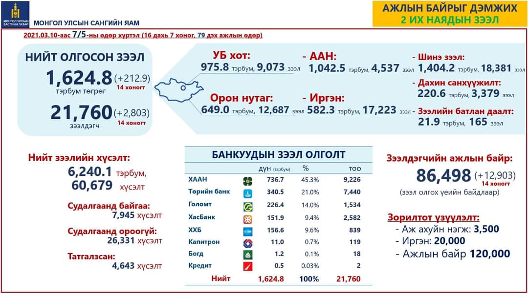 Ажлын байрыг дэмжих зээлд 21 мянган зээлдэгчид хамрагдаж 1,6 их наяд төгрөгийг олгож, 86,4 мянган ажлын байр хадгалсан. Барьцаа хөрөнгийн дутагдалтай нийт 165 иргэн, аж ахуй нэгжид 21,9 тэрбум төгрөгийн зээлийн батлан даалт гаргасан гэв.