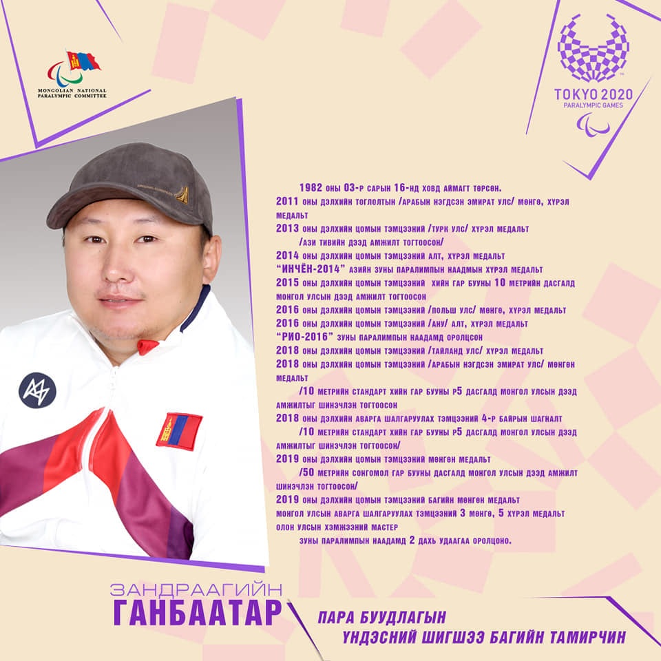 Тодруулбал Олон Улсын хэмжээний мастер Зандраагийн Ганбаатар 10 метрийн хийн гар бууны дасгалд өрсөлдөх юм. Түүний дасгалын тэмцээн Токиогийн цагаар 12 цагт эхэлнэ.