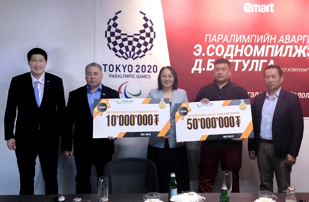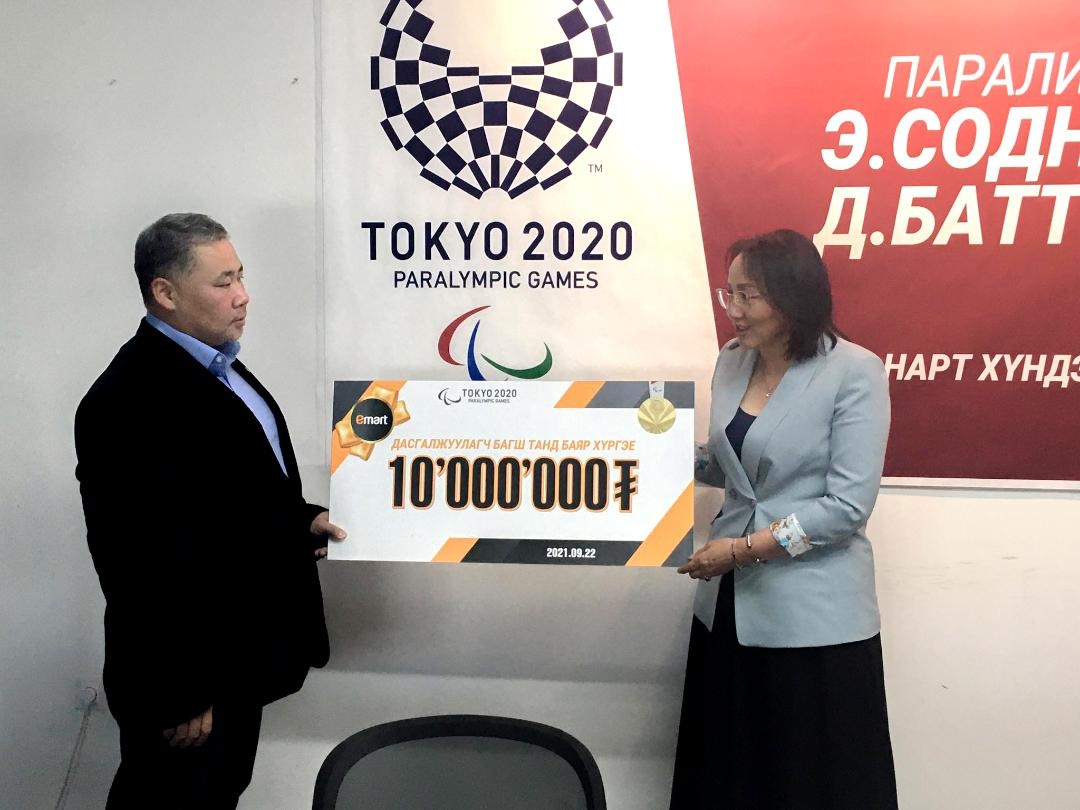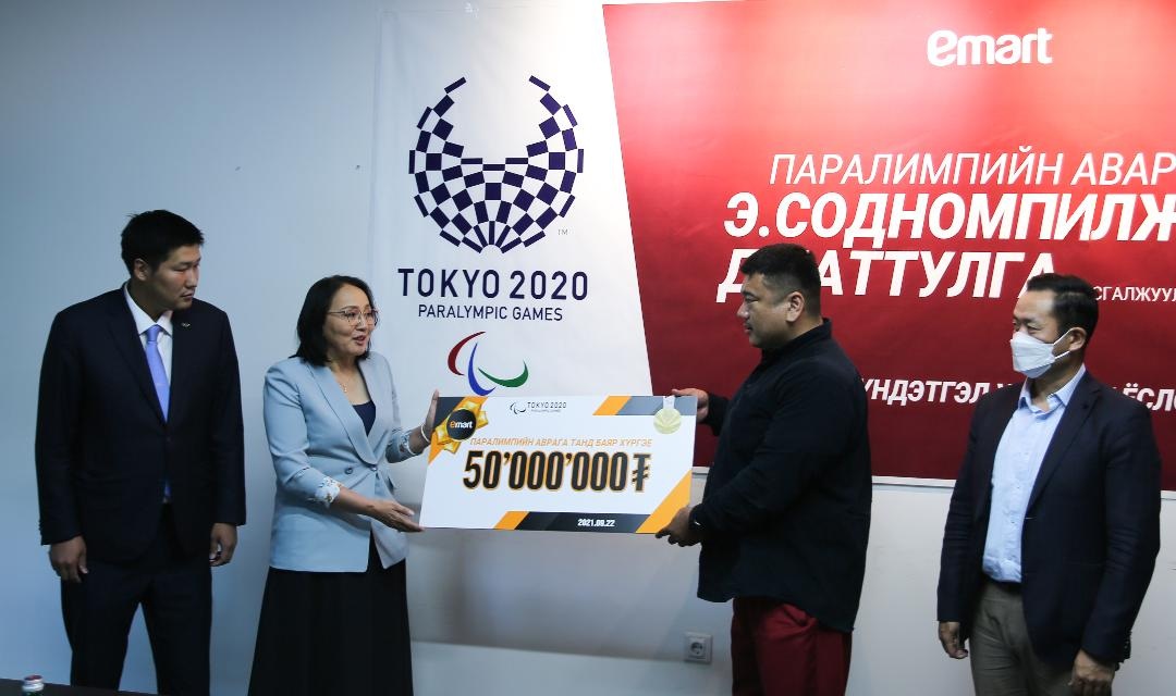 Тодруулбал Имартын зүгээс паралимпийн аварга Э.Содномпилжээд 50,000,000₮, дасгалжуулагч багш Д.Баттулгад 10,000,000₮-ийн мөнгөн урамшуулал гардууллаа.