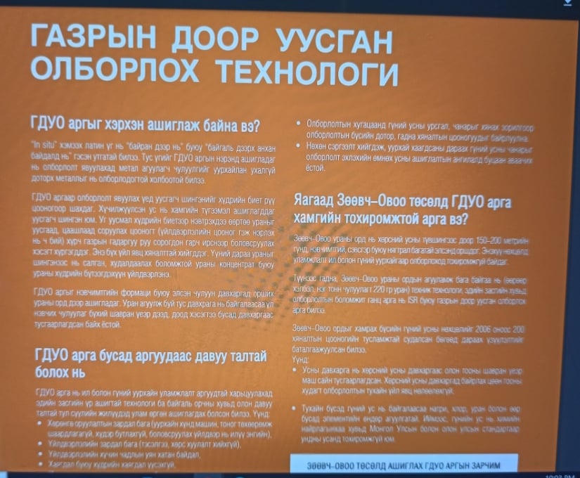 Хамгийн гол нь тус компани ураныг “Газар доор уусган олборлох” технологиор олборлох юм байна. Компанийн танилцуулгад дурдсанаар “Зөөвч-Овоо” ордоос 20 тонн уран олборлохоор зэхэж буй аж. Энд хамгийн том анхаарал татах асуудал үүсээд буй юм. Өнгөрсөн хугацаанд “Дулаан-Уул” ордоос 2.8 тонн ураны шар нутаг гаргаж авахад 440 тонн хүхрийн хүчилтэй шингэнийг хөрсөнд шахсан байдаг нь баримтаар батлагдаад буй. Тэгвэл 20 тонн уран олборлоход 2.8 тонн уран олборлоход ашигласан хүхрийн хүчлийн шингэний хэмжээ даруй 10 дахин их өснө гэсэн үг. Тэр их химийн бодис газрын хөрсөнд шахах цагт Улаанбадрах төдийгүй ойролцоо Хөвсгөл, Зүүнбаян, Сайншанд зэрэг хил залгаа сумдын цаашлаад Дорнын их говийн хүрээлэн буй орчинд хэрхэн нөлөөлөх бол гэсэн төсөөлөл тархи, зүрхтэй хэн бүхэнд буй болж байгаа биз. Асуудлын гол нь энд л буй юм.